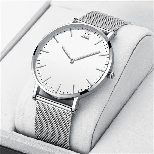 The watch has no visible branding logos, for the clean, sophisticated look.
