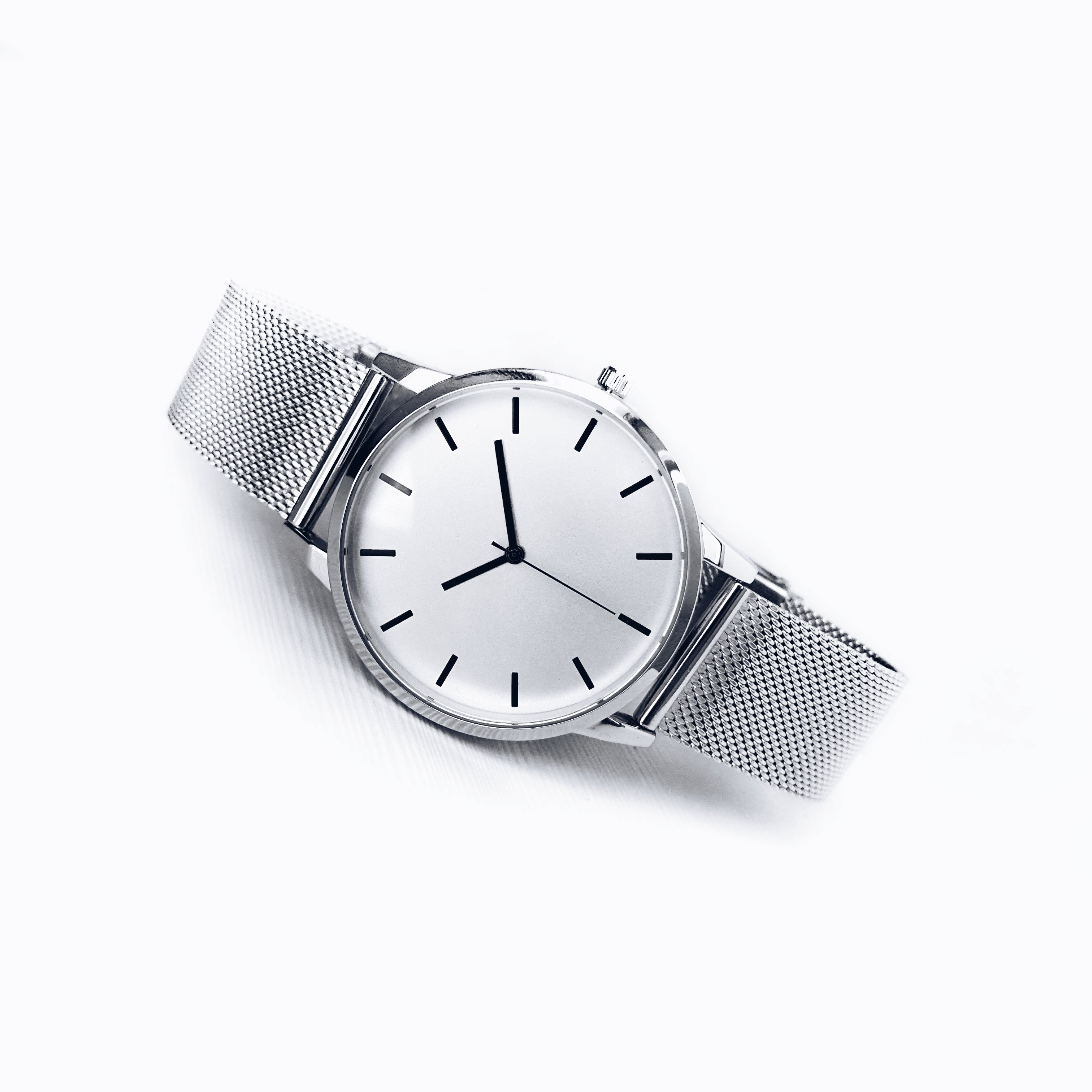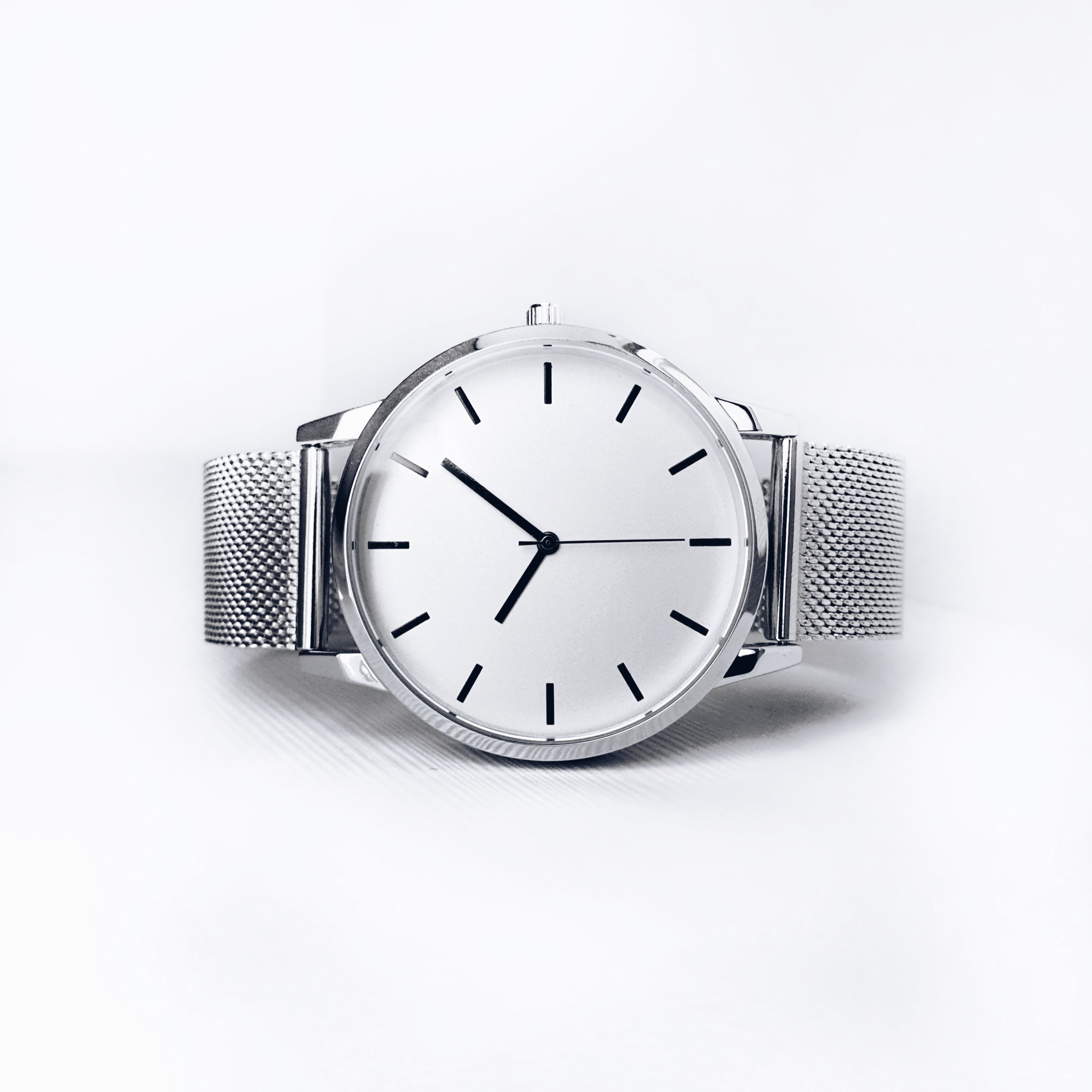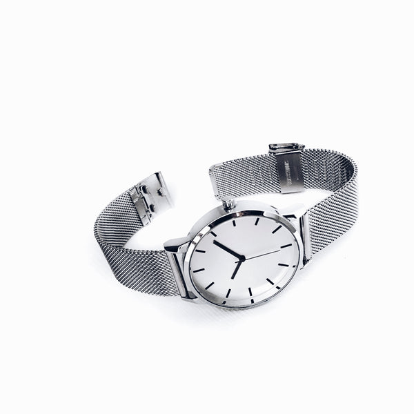 The Monochrome series watch expresses a bold and confident style. The minimalist dial is encased in a 40mm polished silver case, exuding a clean and sharp aesthetic. The straight black hands provide a striking contrast against the matte off-white dial.  Paired with a brilliant silver mesh strap, the watch is a versatile statement piece.